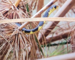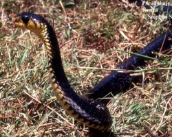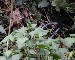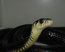 A big slender tree cobra with average adults being between 1.5 and 2 meters, reaching 2.7 meters in length. Gold’s Tree Cobra has a blunt head and very large eye. Shiny and glossy black above with the scales on the sides of the head, chin and throat colored in bright yellow, with black edging. Young snakes have several bands or cross-bars which narrow toward the tail, becoming scattered yellow scales on the rear of the snake.