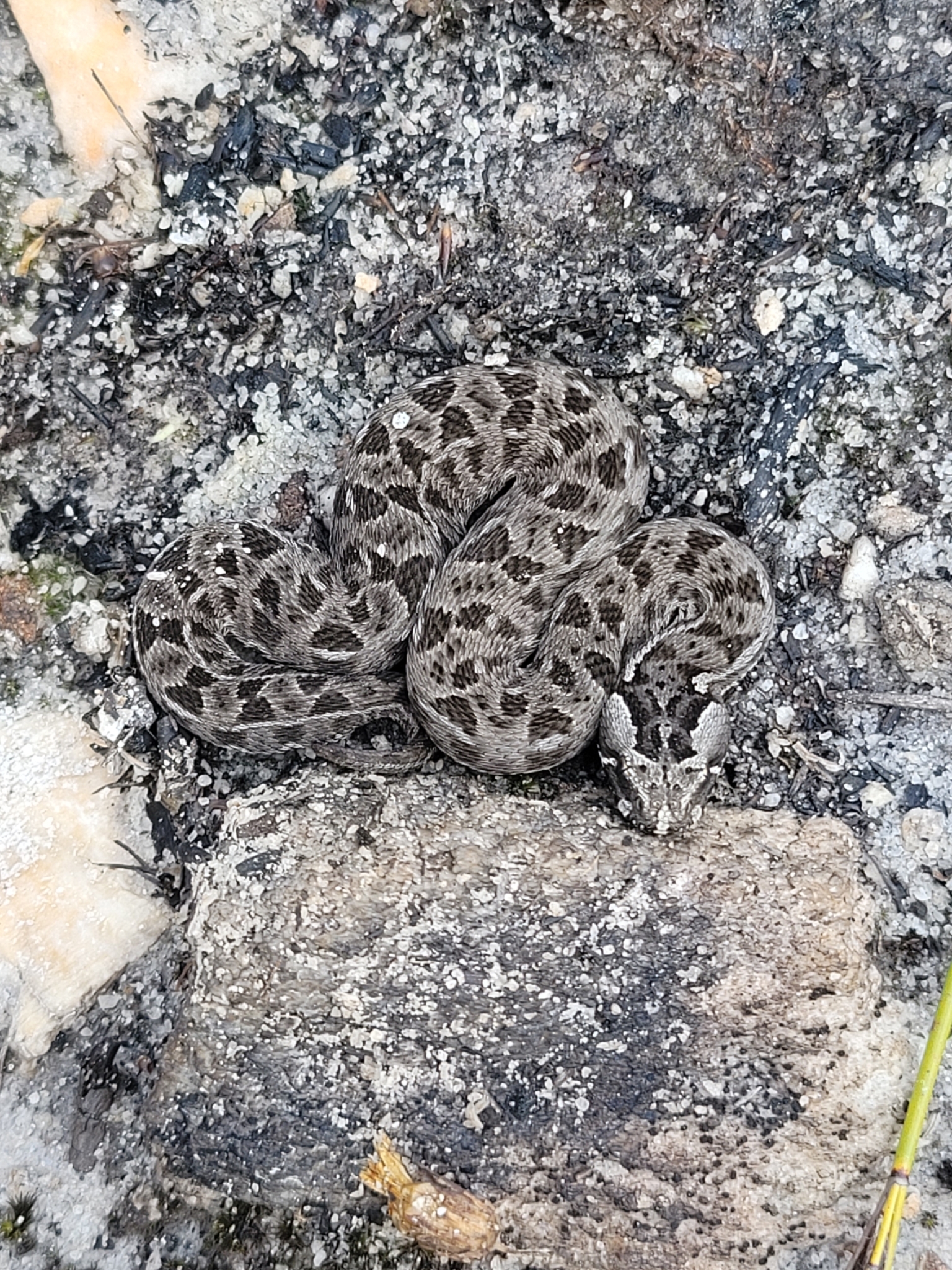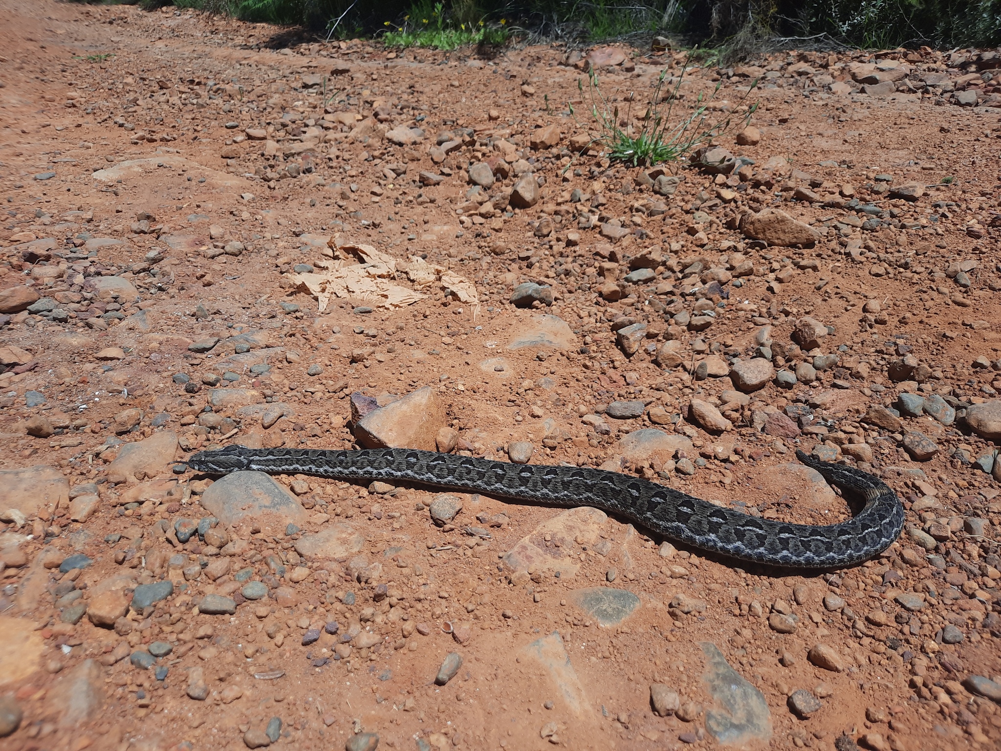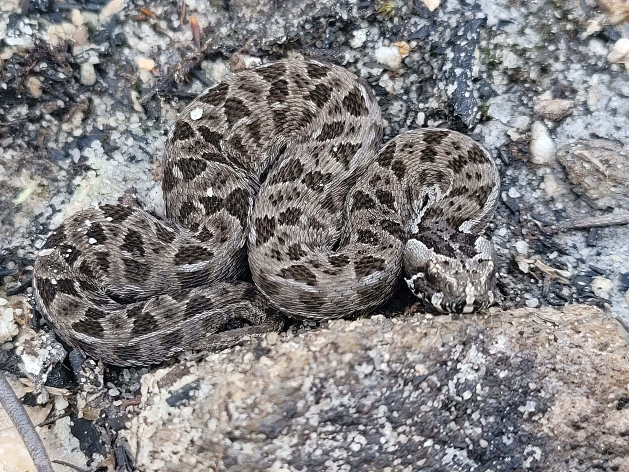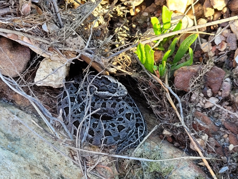 Western Cape Berg Adders are often characterized by their clearly-defined pattern and darker overall grey coloration. This color-pattern serves as excellent camouflage against the dark, often lichen-covered rocky outcrops and fynbos vegetation typical of the Western Cape. They are found from the coast to the mountains, such as the Cederberg, Swartberg & Outeniqua ranges. Their patterning is usually bold and distinct, featuring a series of dark grey or dark brown half-circle (or sometimes more square-ish) blotches along their dorsum. Crucially, these darker markings are frequently outlined with a thin, contrasting white or pale border, which further helps to break up the snake’s outline against a varied background.