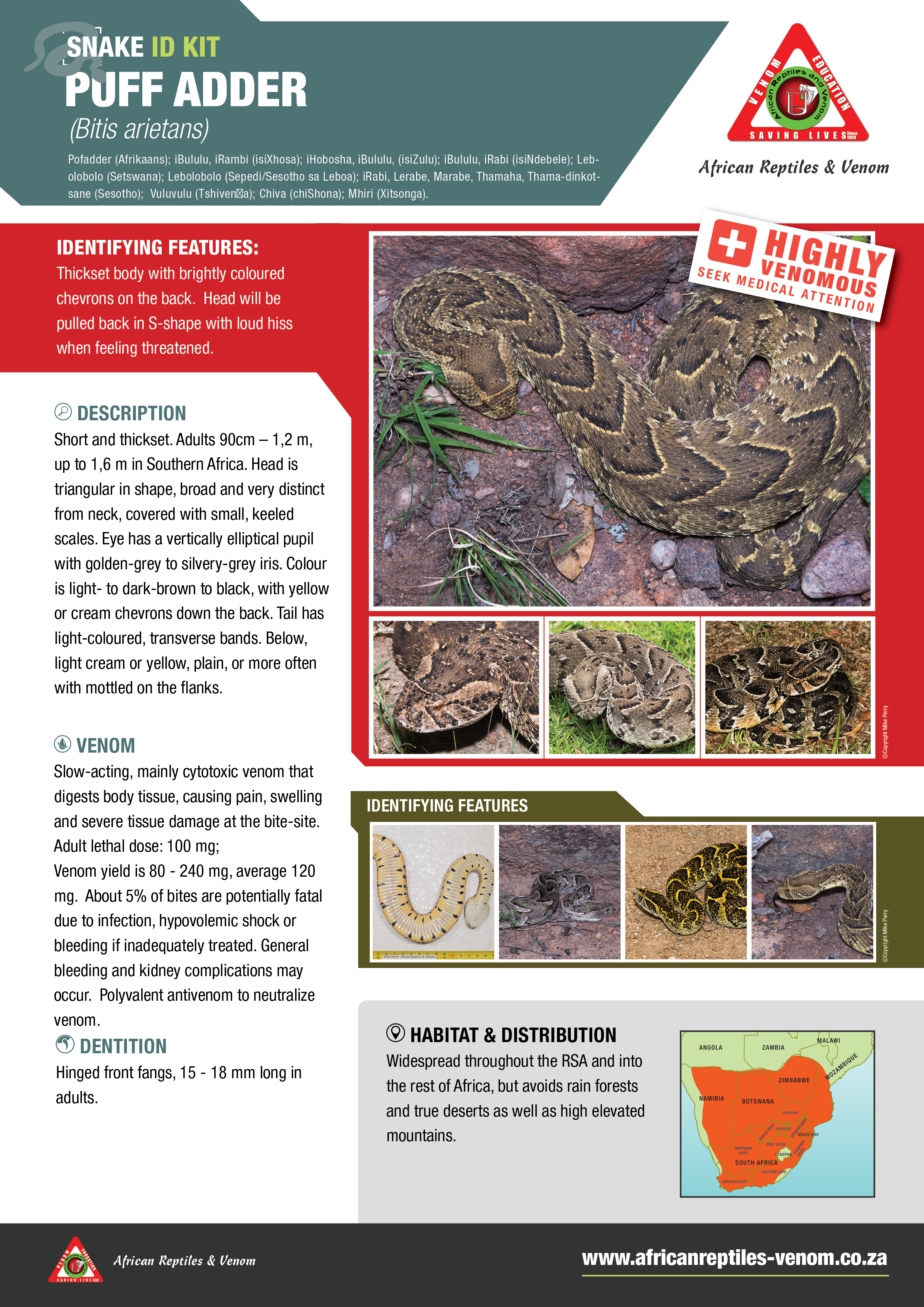 Nocturnal, ambush predator. Emerges during the day to bask. Terrestrial, but often found off the ground, low down in woody vegetation. Remains motionless when approached, relying on cryptic colouration to avoid detection. Accounts for many snakebites in southern Africa. Often killed on roads just after austral spring rains when it emerges to start foraging. Prey on rodents, birds, frogs, toads and lizards. Found around human habitation foraging for prey. The name ‘Puff Adder’ stems from habit of inhaling air and expelling it forcefully through nostrils, producing a loud hiss when agitated. If this warning is not heeded, will strike out to bite. Preyed upon by mongooses, honey badgers, birds of prey, warthog, and other snakes.